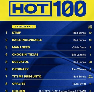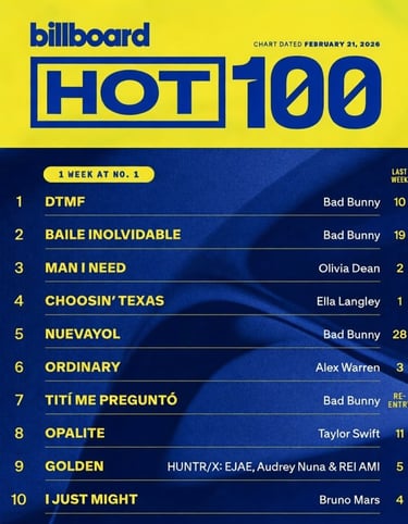 Pero el dominio de Bad Bunny no se queda solo en el primer puesto. El efecto post-show ha provocado un auténtico tsunami en el TOP 10 de Billboard, logrando colar simultáneamente otros tres temazos: "Baile Inolvidable" ha escalado hasta el puesto número 2, "Nuevayol" se planta en el 5 y el ya clásico "Titi me preguntó" resiste con fuerza en el 7. Es una demostración de poderío cultural que reafirma al español como el idioma que dicta el ritmo de la industria global.